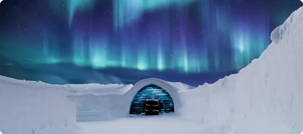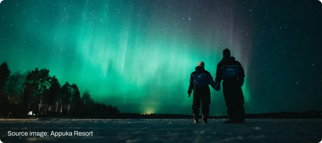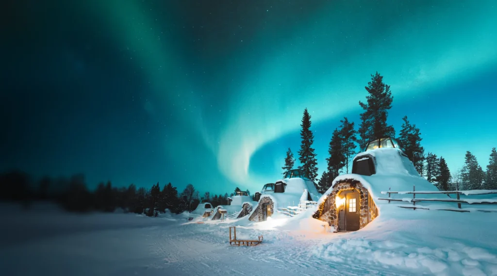 The further north you go, the stronger the aurora activity becomes. While it is possible to see the Northern Lights in southern Finland during strong solar storms, you’ll have much better odds in Lapland, north of the Arctic Circle. Popular viewing areas include Rovaniemi (easy to access by flight), Levi (great for skiing plus auroras), Inari (excellent for remote viewing), and Utsjoki (one of the darkest and most reliable locations). Resorts like Apukka Resort near Rovaniemi allow you to enjoy the aurora directly from glass igloos or Aurora cabins – perfect if you prefer comfort over chasing.